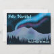 An einer kalten Nacht in Alaska leuchten lila und blaue Nordlichter über schneebedeckte Berge. Spanischer Text, "Feliz Navidad" erscheint in blau-weiß. Fügen Sie Ihren eigenen zusätzlichen Text hinzu.