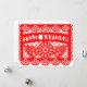 Diese Weihnachtskarte ist mit einem roten Papelpicado mexikanisches Banner mit dem Satz Feliz Navidad auf der Vorderseite in hellem Weiß. Der Rücken sagt: ¡Feliz Navidad y próspero Año Nuevo! (Frohe Weihnachten und ein glückliches Neues Jahr) in einem roten Slab Serif Schriftart. Unten sagt abrazos y besos (Umarmungen und Küsse) mit einem Ort, um mit Ihrem Namen anzupassen