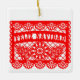 Dieser Weihnachtsschmuck hat ein rotes Papel Picado mexikanisches Banner mit dem Satz Feliz Navidad auf der Vorderseite in hellem Weiß. Die Rückseite hat einen Ort, um sich mit einem Familiennamen und das Jahr in einem roten Slab Serif-Schriftart anzupassen.