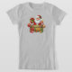 This vibrant design features a cheerful Santa holding a gift and a trumpet, standing behind a wooden sign that says "FELIZ NAVIDAD" (Merry Christmas in Spanish). The sign is beautifully decorated with glowing string lights, ornaments, and holly. It's the perfect shirt for school holiday parties, family gatherings, or Christmas morning.