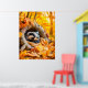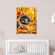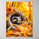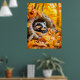 Ein charmantes Schild aus gefühlten flüchtigen Blicken aus einem hohlen Baumstamm in einem Herbstwald. Warme Orange- und Brauntöne schaffen eine gemütliche saisonale Atmosphäre. Ideal für Wald- und Naturdesign.