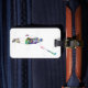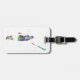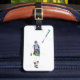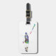 Dynamic watercolor silhouette of a female field hockey player printed on a luggage tag. The colorful and artistic design creates a stylish accessory for sports fans and travelers alike.