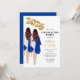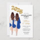 Twins Graduation Party Einladung für Zwillingsschwestern Doppel-Abschluss kombinierte Graduation Party feiern. Portrait von Zwillingsfrauen mit langbraunem Haar in weißem Kleid mit marineblau-blauen Abschluss-Kronen und Gradkappen mit Goldballons für die Klasse von 2025.