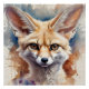 Ein Fennec Fuchs mit detaillierter Aquarellfarbe mit ausdrucksvollen Augen wird vor einem weichen, verschwommenen Hintergrund dargestellt. Die natürlichen Farben verstärken das lebensechte Aussehen.