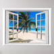 Blick auf den tropischen Strand Ozean, Fake-Fensterwand, für eine fensterlose Bürowand. Spaß, realistische optische Täuschung landschaftliches Poster für ein Büro oder eine Studiowand.