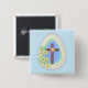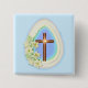 Glühendes Holzkreuz ist mit weißen Lilien und Fenstereiern gerahmt, um die Wiedergeburt zu symbolisieren. Der Hintergrund ist ein schöner Aqua-Schatten. Ein herrliches symbolisches religiöses Design.