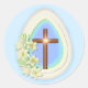 Glühendes Holzkreuz ist gerahmt mit weißen Lilien und Fenstereiern, um die Wiedergeburt zu symbolisieren. Der Hintergrund ist ein schöner Aqua-Schatten. Ein herrliches symbolisches religiöses Design.