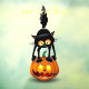 Ein lustiges und erschrecktes KatzenHalloween-Karikaturencharakter stehend auf einem frechen, lachenden Kürbis. Original Humorische Vektor Illustration Copyright BluedarkArt TheChameleonArt.