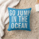Ferienhaus am Strand oder Strandkissen ist die Farbe des Meeres. Mit einem blauen Hintergrund und extra fett formatierten Typografie "Springen in den Ozean" deckt die meisten von einer Seite des Kissens. Mit diesem witzigen Kissen entspannen Sie am Wochenende im Geiste.