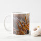 Ein braunes Farnblatt mit Sporen und Spinnennetzen ist an einem kalten sonnigen Vormittag im Dezember mit Hoarfrost bedeckt. Diese Tasse ist eine Geschenkidee für Naturliebhaber. Foto von Katho Menden aufgenommen.