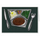Fertiggericht kochte gefrorene Mahlzeit (Fleischpastetchen, Kartoffelpürees, Erbsen und Himbeertorte) im Silbertablett mit silbernem Messer und spork Art.