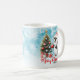 Diese festlich blaue und rote personalisierte Kaffeemaschine-Tasse zeichnet sich durch das Sprichwort "Frohe Weihnachten" und die Vorlage für den Familiennamen aus, die mit einem niedlichen Pinguin in einer roten Weihnachtsmannmütze verziert sind, der einen Weihnachtsbaum schmückt.