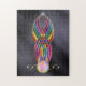Ein leuchtend farbiger fließender abstrakter, goldfarbener und mit Diamanten und Perlen bestückter gerahmter Fluss. Glatzende, leuchtende Strömungen roter, gelber, grüner, blauer, lila und rosa Kurve glatt, knusprig von einer großen Perle bis zur Spitze, am Ende durch eine Sternexplosion betont. Dieses Regenbogendesign wird vor einem Hintergrund aus schwarzer Seide gelegt.