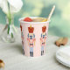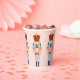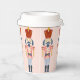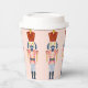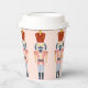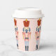 Dieser Papierbecher ist mit einem sich wiederholenden, pastellfarbenen Nutcracker mit einem roten Hut auf einem rot-rosa Hintergrund versehen. Die Farben Rot, Blau, Marine, Rosa und Weiß.