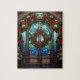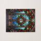 Das gefestigte Glasdesign einer Doppeltür mit einem Kranz in der Mitte mit kranberry gefärbten Früchten. Rote Poinsettien schmücken die Tür in einem Bogen. Der Hintergrund des Fensters ist in verschiedenen Blau- und Grüntönen gehalten.