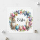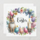 Dies ist eine festliche Osterillustrierung. Zu den zentralen Elementen zählen ein niedlicher, brauner Hasen, eine Sammlung pastellfarbener Ostereier, verschiedene Blume und Blätter, eine beleuchtete Kerze in einem verzierten Halter, ein Bandbogen und ein Schmetterling, die das Feste und die Krumauer noch verstärken. Der Text "Happy Oaster" wird in elegantem Skript deutlich dargestellt.