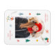 Festlicher Urlaubsmagnet mit einem gewölbten Foto umgeben von bunten Skifahrern, Sternen und Pinien. Personalisieren Sie den Weihnachtsmagneten des Fotos mit Ihrem individuellen Gruß (derzeit als "Frohe Weihnachten" gezeigt), Familienname und Jahr in roter Schrift.