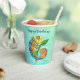 Diese Papiertassen sind eine Mischung aus Blau und Grün mit einer festlichen Fantasieeidechse in lebhaften Farben Grün, Blau, Gelb, Orange, die ein grünes Blatt auf einem Stock trägt. Passen Sie den Happy Birthday Text mit den Vorlagen vorne und hinten an.