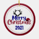 Weihnachtsschmuck für Haustiere in runder Keramik, mit Grafiken eines gerahmten, roten Fotos, vorne mit weißem Foto. Die Rückseite ist in rot, blau und weiß mit grafischem Text gelesen Frohe Weihnachten und ein individuelles Jahr für Sie zu personalisieren. Fügen Sie Ihrem Haustier das Bild, den Namen und das Jahr für einen großen Feiertagsschmuck, um sich an Ihr Haustier zu erinnern.