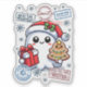 Ein skurriler Weihnachtsaufkleber zeigt einen fröhlichen Geist, der eine Weihnachtsmannmütze trägt und ein hell umhülltes Geschenk hält. Umgeben von festlichen Briefmarke und Schneeflocken, erfreut es sich an der angenehmen Atmosphäre der Feriensaison und lädt zum Genießen und Vergnügen ein.