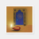 Happy Diwali Illustration: rote Diya (eine becherförmige indische Öllampe) vor einem indianischen Zierfenster mit Feuerwerk draußen.