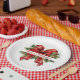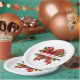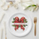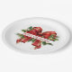 Papier Teller mit einem festlichen Weihnachtsbogen in Rot und Gold. Umgeben von Poinsettia Blume, Kiefern und Weihnachtsdekorationen.