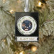 Festivals Unser erstes Weihnachtsskript-Foto Silver Plated Banner Ornament. Das Design mit den Kiefernästen in einem Kreis, Foto in einem Kreisrahmen, modernes goldenes Drehbuch - personalisieren Sie das Ornament mit Ihrem Foto und Text.