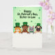 Designed with four friendly cartoon animals along the bottom—an orange cat, a brown dog, a small grey pet with a green bow tie, and a tan-faced companion with a snouty grin—this St. Patrick’s Day scene feels like a close-knit group leaning in together. Each one wears a green top hat with a gold buckle, and their wide eyes and open smiles suggest the kind of easy affection you’d share with a sister-in-law. They peek over a white banner that stretches across the lower portion, creating a cozy “we’re in this together” moment. The background fades from deeper green at the top to lighter green below, sprinkled with small clover shapes that drift around like confetti ☘️. Near the top, the message “Happy St. Patrick’s Day, Sister-in-Law” sits centered in dark green letters, standing out clearly against the pale green backdrop 💚. The orange cat gives a wink while the brown dog pants happily, adding a teasing, friendly energy between the characters. The grey pet’s bow tie pops in bright green, and the hats line up neatly as the white banner runs straight across the bottom edge.