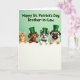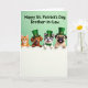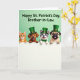 At the center of the card is a digital illustration of four friendly animal companions leaning close together as they peek over a white fence, their faces gathered like close friends sharing a secret 💚. From left to right, you see a striped ginger cat with bright green eyes, a light brown dog with a wide grin, a gray-and-white dog wearing a small green bow tie, and a fawn-colored short-nosed dog with a wrinkled face and its tongue hanging out. Each one wears a green top hat with a gold buckle, and their matching accessories make them look like a little group ready to celebrate ☘️. The background is a soft, pale green that keeps the focus on their expressions and gives the scene a gentle, friendly glow. Their eyes and smiles angle toward one another, adding a tender, companionable feel as if they’re posing together for someone they care about. Across the top, a greeting appears in large green letters, centered above the animals and easy to read against the light background. The white fence runs straight across the lower portion, with the four hats and heads lined up evenly above it.