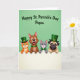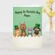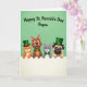 Designed with a spring-green background, this St. Patrick’s Day card features four friendly animals peeking over a bright white ledge, their paws curled over the edge as if leaning in close. An orange cat on the left wears a green top hat with a small gold buckle, tilting its head toward the group with an affectionate, inviting look 💚. Next to it, a brown dog smiles wide with a green collar, angled slightly toward the others like it’s sharing a private joke. A gray cat in the middle keeps a calm, tender gaze and a green bow tie, adding a gentle note of friendship to the lineup. On the right, a fawn-colored dog with a softly wrinkled face and soulful eyes wears another green top hat, giving the scene a cozy, caring energy ☘️. Across the upper area, a short greeting appears in dark green letters, centered and easy to read against the green backdrop. The characters sit along the lower portion of the design, with the crisp white ledge forming a strong horizontal band beneath their faces and paws.