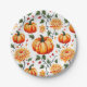 Paper plates in a fall-themed pattern featuring vibrant orange pumpkins intertwined with blooming chrysanthemums in warm yellow and orange hues, creating a festive harvest-inspired design