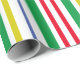Bright green, red, gold and blue vertical stripes on a white background creates a beautiful and festive wrapping paper for your holiday gifts!