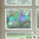 This window cling has the text Merry Christmas in festive colourful letters of blues, green, and purples with yellow star accents.
