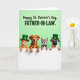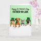This card shows four cozy domestic animals lined up as if leaning in together like close friends, peeking over a white horizontal ledge with their front paws resting on top. On the left, an orange tabby kitten wears a small green top hat and looks up with wide, gentle eyes that feel a little bashful and sweet 💚. Next to it, a golden-brown dog smiles with an open mouth, as if happily sharing the moment with the group. A sleek gray tabby in a green bow tie sits third, holding a calm, curious gaze that pairs nicely with the others’ warmer expressions. On the right, a fawn-colored dog with a wrinkled face wears another green top hat, looking serious yet affectionate, like it’s trying not to grin ☘️. The background is a soft pastel green gradient that keeps the scene light and festive without distracting from the animals. Across the top, dark green text is centered and easy to read, while the white ledge below creates a strong contrast under their paws and accessories. The kitten and the fawn-colored dog both have green hats, and the gray tabby’s bow tie matches the dark green lettering above.