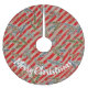 A festive rustic kraft vintage looking holiday tree skirt featuring red wide stripes with pine and spruce tree branches and pine cones painted in watercolors with Merry Christmas written in a snowy white font which can be edited or removed.
