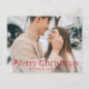 Einfache Urlaubspostkarte mit Ihrem vollbluten horizontalen Foto mit "Frohe Weihnachten" in eleganter roter Schrift. Personalisieren Sie die elegante Weihnachtspostkarte des Fotos mit Ihrem Familiennamen und dem Jahr. Die Postkarte kehrt zurück, um Ihre Rücksendeadresse und Ihre persönliche Nachricht anzuzeigen.