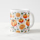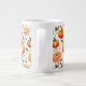 Riesen-Tasse im Herbstmuster mit lebhaften orangefarbenen Kürbissen, die mit blühenden Chrysanthemen in warmen Gelb- und Orangentönen verwoben sind und ein festlich inspiriertes Design schaffen