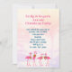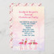 Festliche Flamingos Feier Einladung mit einem tropischen Thema. Füllen Sie die einfachen Vorlagenbereiche für einen Party-Titel - einschließlich der Namen des Hosts / Hosts. Das Bild von den Palmen im Hintergrund ergänzt das tropische Thema mit vier krautartigen rosa Flamingos am unteren Ende der vertikalen Karten. Reverse hat ein Flamingo-Muster. Eine Änderung der Größe kann einen Teil des Designs abschneiden.
