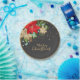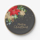 Auf dieser Papiertafel befindet sich ein Poinsettia-Arrangement in der oberen links Ecke mit den Worten "Frohe Weihnachten in Gold auf schwarzem Hintergrund mit goldenem Rand.