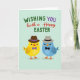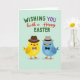 Entworfen mit zwei stilisierten Vogelcharakteren, die einander zugewandt sind, setzt die Karte durch ihre engen, gespiegelten Posen und rosigen Wangen einen freundlichen, leicht romantischen Ton 🌷. Ein sanfter mintgrüner Hintergrund hält die Szene ruhig, während die einfachen Formen und flachen Farben hervorstechen. Links trägt ein goldgelber Vogel einen braunen Fedora mit einem kleinen violetten Band und einer passenden violetten Fliege, was ihm ein herausgeputztes Aussehen verleiht. Rechts trägt ein himmelblauer Vogel einen grauen Fedora mit einem dunklen Band und einer dunklen Fliege, was seinem Begleiter wie ein koordiniertes Paar entspricht 🐇. Ihre winzigen Punkt-Augen und sanften Errötungen lassen sie liebevoll aufmerksam erscheinen, als ob sie einen stillen Witz teilen. Über dem oberen Rand ist der Grußtext in einigen Zeilen angeordnet, wobei grüne, warme rote und violette Buchstaben gemischt sind, sodass die Wörter lebendig wirken, ohne laut zu sein. Die Buchstaben verwenden verschiedene Stile und Größen und erzeugen