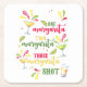 Dieser spielerische Untersetzer zeichnet sich durch ein Aquarelldesign mit festlichen Margaritas und dem Sprichwort "one margarita, two margarita, three margarita, shot!" aus. Die Farben sind rot, grün und gelb.