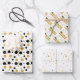 2025 Papierfolien für Graduate Wrapping Das oberste Blatt zeichnet sich durch ein Design aus schwarzen und goldenen Punkten unterschiedlicher Größen auf weißem Hintergrund aus. Das mittlere Blatt zeigt diagonal den Text "2025" in Gold, durchbrochen mit goldfarbenen Glitzer-ähnlichen Spkles auf weißem Hintergrund. Das untere Blatt hat ein Muster kleiner goldener Sterne, verteilt auf einen weißen Hintergrund. Diese Blätter sind ideal, um Abschluss Geschenke zu verpacken, und fügen eine Touch von Eleganz und Festlichkeit zu feiern.