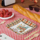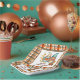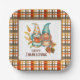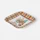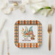 Niedliche Papiertafel im Erntedank mit Kürbiskuchen und Kürbiskuchen mit kariertem Hintergrund im Herbst und "Happy Thanksgiving"-Text. Ideal für Erntedank- und Büroabende.