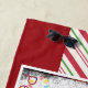 Ein Strandtuch mit einem Foto eines süßen Mops Welpen, der bei einer roten Weihnachtsmannmütze schläft. Fröhliche Weihnachten ist auf der Hutband geschrieben, in einem trendigen handgeschriebenen Schriftart. Eine schwarze Grundierung mit bunten Lichtern umgeben den Rahmen dieses bezaubernden Fotos. Der Hintergrund ist ein festliches, von Zuckerrohr gestreiftes Muster in rot-weiß und grün. Am unteren Rand steht ein individualisierbarer Text: Frieden, Freude und Möpsen.