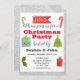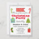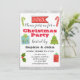 Feierliche Weihnachtsfeier Party Einladung mit einer Glitzern-Grenze in Silber-Glitzer und niedliche rot-grüne Illustrationen eines Weihnachtsbaumes, Bonbons, Geschenke und Heilige. Die Worte "Weihnachts-Party" sind in einem fett hellen, roten Schriftart geschrieben.