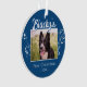 Festliche erste Weihnachtsreise Welpe Foliage Blue Foto Ornament. Sehr schönes weißes Blattwerk und ein eigener Hundename in einem Trend-Skript. Personalisieren Sie das Ornament mit dem Foto, dem Namen und dem Geburtsjahr Ihres Hundes - geben Sie Ihr Lieblings-WelpenFoto ein. Sie können dieses maßgeschneiderte Ornament für jedes Haustier verwenden. Ein herrlicher Ferien-Sake für einen Hundebesitzer.