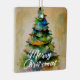 Festliche Wasserfarben Weihnachtsbaum Künstlerisch Zeichnend Foto Keramik Ornament. Festliche Aquarellfarbe zeichnend von bunten Weihnachtsbäumen mit einem fröhlichen Weihnachtswunsch in einem trendigen Drehbuch. Passen Sie Foto, Familienname und Jahr an.