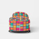 Die Tasche zeichnet sich durch ein farbenfrohes Patchwork-Design aus, mit quadratischen Quadraten gleicher Größe, die in einem Rastermuster angeordnet sind, und schafft so ein lebendiges und auffälliges Aussehen.