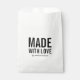 Stilvolle Gefälligkeitstasche mit dem Wort "Made with Liebe" in fett gedrucktem Schriftart und einem stilvollen Skript für Ihren Namen oder Shop-Namen in schwarz. Es ist großartig für Ihre handgefertigten oder hausgemachten Waren und Geschenke. Es ist einfach zu personalisieren; Sie können den Platzhalter-Text ersetzen, um Ihre eigenen Informationen hinzuzufügen. Für weitere Optionen, wie zum Beispiel den Schriftart und seine Größe ändern, klicken Sie auf die Schaltfläche "Anpassen". *Bitte beachten Sie, dass das Zazzle-Wasserzeichen in der Zoomvorschau NICHT auf dem gedruckten Endprodukt © Rosewood and Citrus erscheint