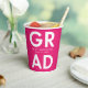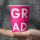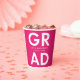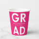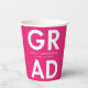 Personalisierte Abschluss-Papiertassen mit "Grad" in fett weißer Schrift mit einem heißen rosa Hintergrund oder einer Farbe Ihrer Wahl. Personalisieren Sie die Papiertassen des Abschlusses, indem Sie den Namen des Absolventen und das Abschluss Jahr. Die hellrosa Abschluss-Papiertassen eignen sich sowohl für Uni-Abschluss- als auch für Highschool-Partys.